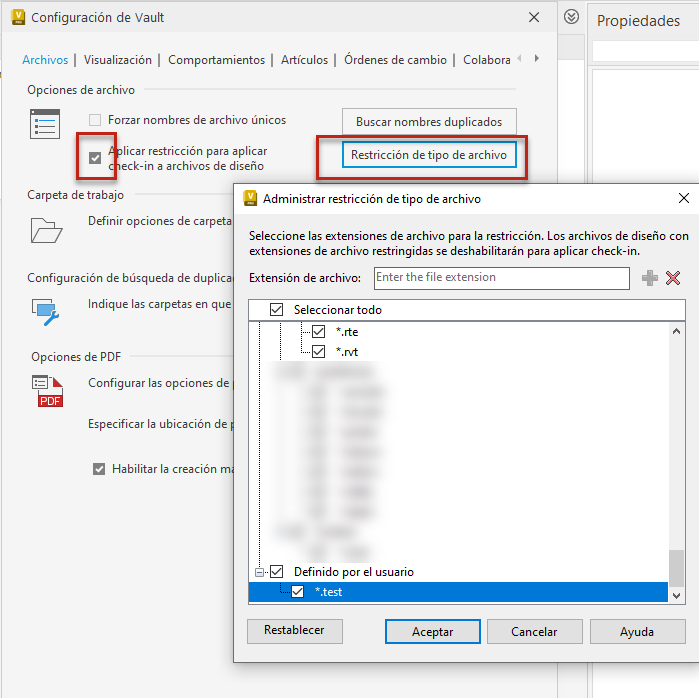 Como administrador, puede definir la lista de archivos de diseño a los que no se aplicará check-in cuando la opción "Aplicar restricción para el check-in de archivos de diseño" esté activada. Puede añadir las extensiones de archivo a la lista definida por el usuario, pero no puede eliminar las extensiones por defecto del sistema.
