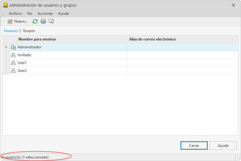 Ahora puede ver el recuento total y el número de usuarios (y grupos) seleccionados en el cuadro de diálogo Administración de usuarios y grupos. El recuento se basa en el número mostrado de usuarios y grupos.