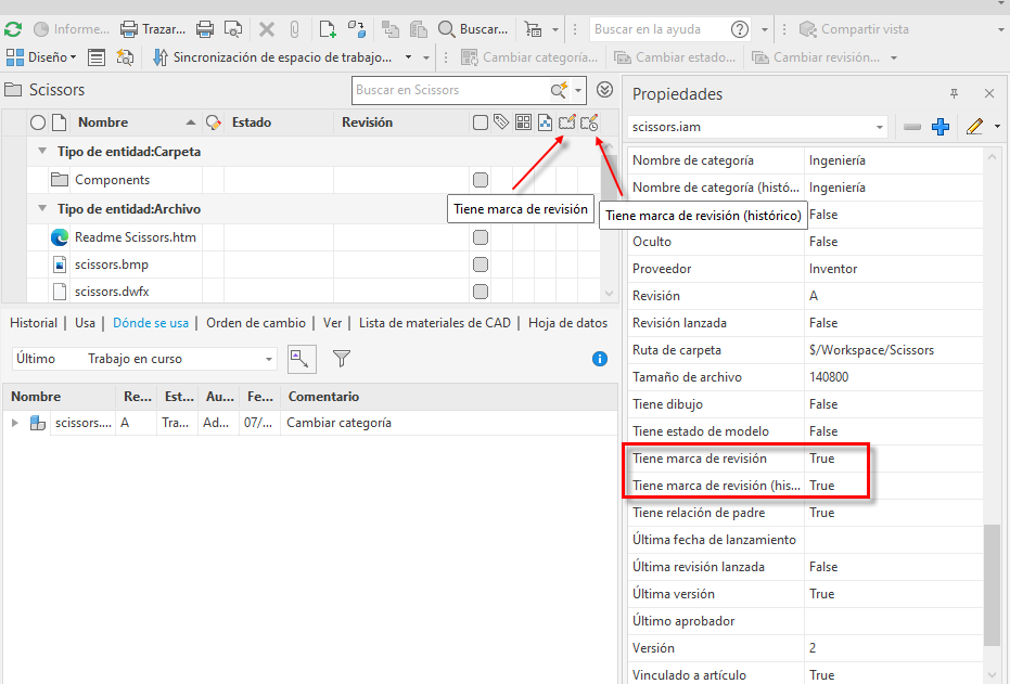 Se han añadido dos nuevas propiedades de sistema "Tiene marca de revisión" y "Tiene marca de revisión histórica" para ayudar a identificar archivos o versiones con datos de marcas de revisión asociados. Con estas propiedades, puede filtrar todos los archivos de un proyecto que tengan datos de marcas de revisión, tanto históricos como los últimos.