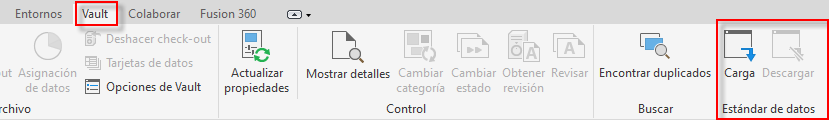 En Autodesk Inventor, utilice el botón Cargar o Descargar de la cinta de opciones de Vault para activar o desactivar el complemento Estándar de datos.
