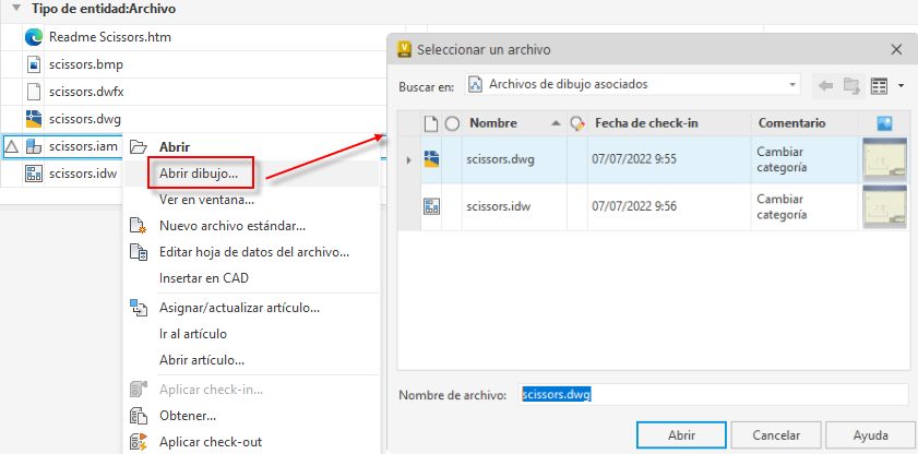 En el menú contextual de archivo, se ha añadido el comando Abrir dibujo para abrir el archivo de dibujo asociado desde Vault Client.