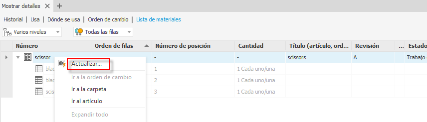 Utilice el comando Actualizar del menú contextual de la ficha Mostrar detalles de la lista de materiales para actualizar la lista de materiales de artículos. Con esta mejora, no es necesario ir a la ficha Usa o al Artículo de Vault Explorer para obtener el comando Asignar/Actualizar.