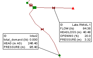Etiquetas de GeoPlan que muestran los resultados para un nodo y una válvula