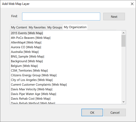 | Buscar | Busca una capa de mapa en línea. Al especificar todo o parte del nombre de capa de mapa que desea buscar en este campo, se resalta la primera instancia en la lista. |