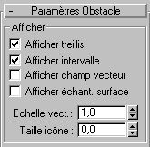 Un champ vectoriel, généré autour d'un obstacle, permet aux membres de la foule d'éviter cet objet dans la scène. Ce champ est constitué d'un tableau de vecteurs à trois dimensions qui guide les représentants et les autres objets autour de l'obstacle. Les paramètres de ce panneau déroulant permettent de déterminer comment les vecteurs sont générés, comment ils s'affichent et comment ils influencent d'autres objets.