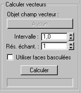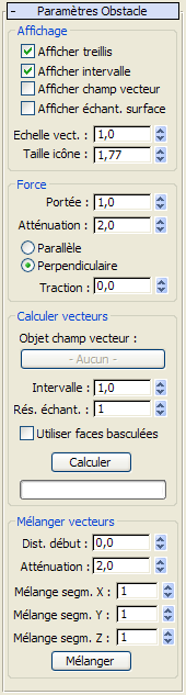 Permet de désigner l'objet Obstacle. Cliquez sur ce bouton, puis sélectionnez l'objet autour duquel le champ vectoriel doit être généré. Le nom de l'objet apparaît ensuite sur le bouton (initialement intitulé Aucun).