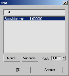 La boîte de dialogue Etat vous permet d'ajouter et de supprimer des comportements de l'état du contrôleur cognitif dans une simulation Crowd, ainsi que de préciser le poids de chaque comportement.