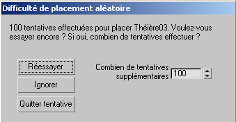 Cette boîte de dialogue s'affiche lorsque character studio a des difficultés à placer des objets clonés sans les superposer à l'aide de la boîte de dialogue Objets dispersion. Le texte de la boîte de dialogue indique le nombre de tentatives de placement d'un objet effectuées par character studio et vous demande si vous souhaitez essayer de nouveau.