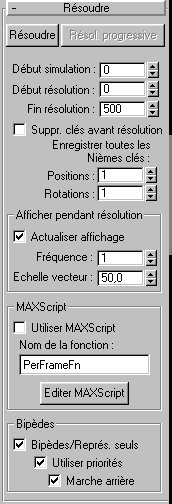 Pour mettre fin à une résolution en cours et enregistrer toutes les clés générées jusqu'à ce point, appuyez sur la touche Echap. Lorsque vous effectuez cette opération, Character Studio ne tient pas compte des paramètres autres que ceux par défaut de l'option Enregistr. ttes les Nièmes clés. Dans le cas des simulations complexes, vous pouvez gagner du temps en appuyant sur Maj+Echap pour arrêter une résolution sans enregistrer les clés.
