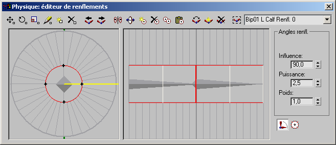 Par exemple, si vous avez défini un angle de renflement à 90 degrés pour l'articulation, une Valeur d'influence de 40 signifie que l'effet de renflement commencera à apparaître lorsque l'articulation en rotation atteindra 50 degrés (90 - 40) ou 130 degrés (90 + 40).