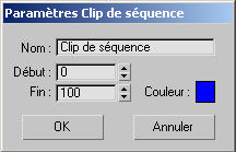 Spécifiez un nom pour le clip, une image de début et de fin et une couleur à l'aide des commandes de la boîte de dialogue Paramètres Clip de séquence. Character studio détermine les clips à déclencher en fonction des états que vous avez définis sur le groupe de fonctions Etat.