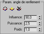 - Valeur à ajouter ou à soustraire à l'angle de renflement pour que le renflement affecte la peau. Cette valeur est comprise entre 0 et 180. Par défaut = 90 degrés.