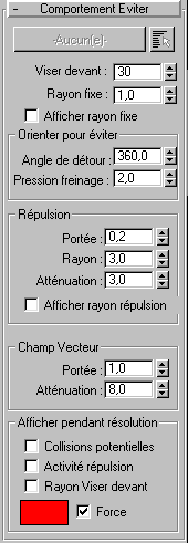 - Affiche la couleur utilisée pour dessiner le vecteur de force Eviter lors de la résolution de la simulation. Cliquez sur la zone afin de sélectionner une autre couleur. Valeur par défaut : rouge.