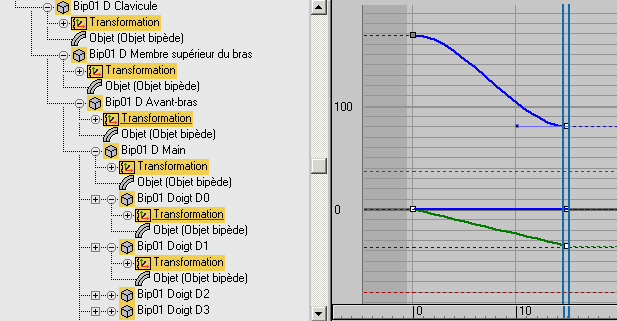 Il existe une piste de doigt par main par défaut. Les clés de doigt sont stockées dans la piste de transformation Doigt0, qui correspond au premier segment du pouce du bipède.