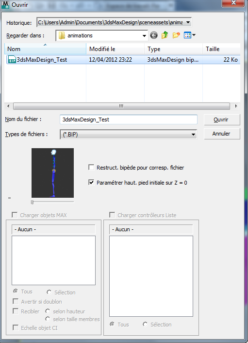 Lorsque vous chargez un fichier FIG en mode Personnage, la boîte de dialogue d'ouverture de fichiers Windows standard s'affiche. Cependant, lorsque vous chargez des fichiers BIP ou STP, vous pouvez afficher un aperçu de l'animation et contrôler la quantité d'informations chargée pour votre bipède.