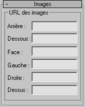 Le panneau déroulant Images permet de spécifier un jeu d'images pour définir le panorama d'arrière-plan compris entre les objets de la scène et la toile de fond que constituent le ciel et le sol. Le panorama comprend six images, chacune d'elles étant appliquée sur l'une des faces d'un cube infiniment grand centré dans le système de coordonnées local.