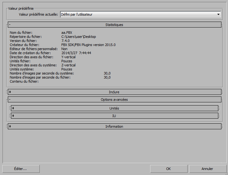 Le panneau déroulant Informations contient des données relatives au 3ds Max FBX plug-in, ainsi qu’un bouton vous permettant d’accéder à l’aide sur ce 3ds Max FBX plug-in.