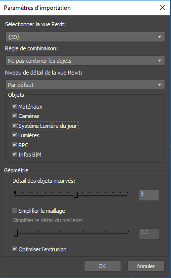 Ne pas combiner les objets (par défaut) Chaque objet Revit est importé comme un seul et même objet 3ds Max.