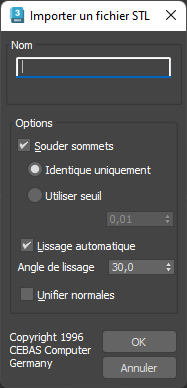 - Identique uniquement Lorsque cette option est activée, l’importation STL utilise un algorithme de soudage optimisé pour le format STL. Cette opération de soudage consiste à souder uniquement les sommets qui occupent les mêmes coordonnées spatiales (identiques) sur les axes XYZ. Cette méthode peut se révéler jusqu’à 30 fois plus rapide que la méthode de soudage standard de 3ds Max. Son utilisation est vivement conseillée.