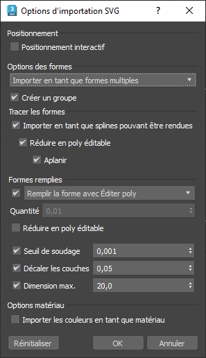 - Si cette option est sélectionnée, les formes sont décalées dans la position Z locale, selon la quantité spécifiée et selon l’ordre des couches. Si cette option est sélectionnée, le fichier SVG est mis à l’échelle de sorte que la plus grande dimension corresponde à la valeur spécifiée. Cela peut être utile, car l’échelle codée des fichiers SVG peut varier considérablement. Pour une exportation et une importation bidirectionnelles des fichiers SVG à une échelle précise, vous devrez peut-être désactiver cette option.