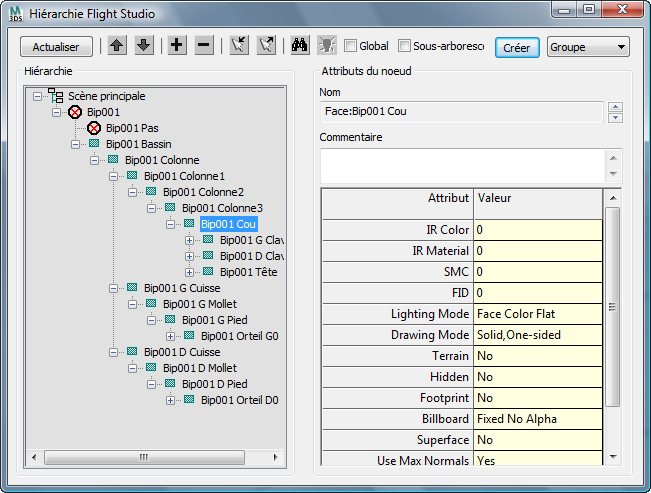 Les noms des noeuds de la fenêtre Hiérarchie correspondent également à leurs noms d'objets 3ds Max.