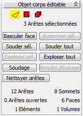 - Boutons permettant d'accéder aux niveaux de sous-objets Arête, Face et Elément de l'objet corps. Le niveau Opérande est disponible uniquement à partir de la pile de modificateurs.