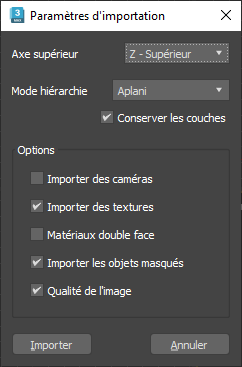 - Aplani : les objets ne sont pas regroupés et sont importés en tant qu’objets 3ds Max indépendants.