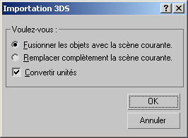 Lorsque vous utilisez la commande Importer pour importer une géométrie dans une scène qui en contient déjà une, 3ds Max ouvre dans la plupart des cas une boîte de dialogue vous invitant à choisir d'ajouter la géométrie importée à la scène ou de remplacer entièrement la scène.