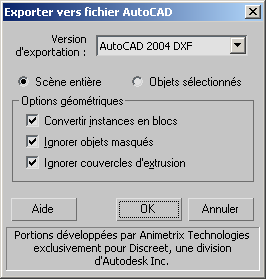 Remarque : l'outil d'exportation DXF permet uniquement d'exporter des données sur le maillage. Toutes les formes et splines sont donc exportées en tant qu'objets maillage. Les splines ouvertes (ne pouvant être converties en objets maillage) dans la scène ne sont par conséquent pas exportées.
