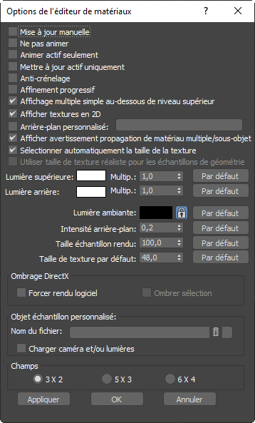 Ce bouton affiche la boîte de dialogue Options de l'éditeur de matériaux qui vous permet de contrôler la façon dont les matériaux et les maps sont affichés dans les