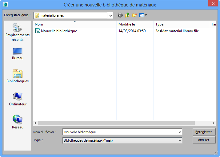 3ds Max enregistre la bibliothèque en tant que fichier MAT en utilisant le nom que vous avez indiqué; par exemple, Nouvelle bibliothèque.mat. L'emplacement par défaut de la bibliothèque est le dossier \materiallibraries dans votre projet en cours. Si vous n'avez pas défini de dossier de projet, la nouvelle bibliothèque est enregistrée dans le dossier <3ds Max dossier Programme>\materiallibraries .