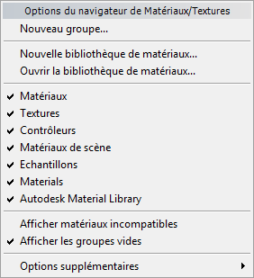 Options Menu du navigateur de matériaux/maps