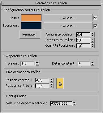 Couche sous-jacente de l'effet de tourbillon. Cliquez sur l'échantillon de couleur pour changer la sélection courante. Cliquez sur Aucun pour affecter une map au lieu d'une couleur. La case à cocher permet d'activer ou de désactiver la texture.