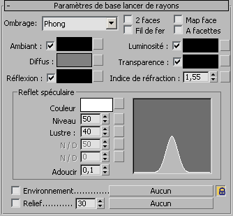 Le panneau déroulant Paramètres de base lancer de rayons d’un matériau Lancer de rayons contrôle l’ombrage du matériau, les composants de couleur, la réflectivité ou la réfractivité, et les reliefs.