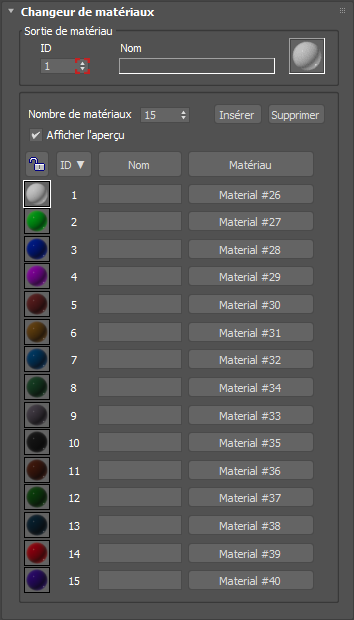 - Cliquez pour définir le matériau de sortie sur le numéro d’index (ID) indiqué (ordre décroissant ou croissant).