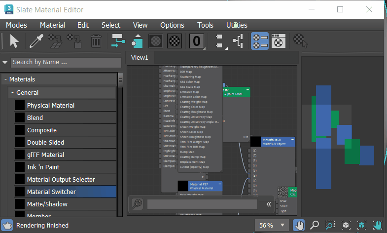 La vue active contient un outil de recherche pour trouver des matériaux, textures, nœuds et contrôleurs.