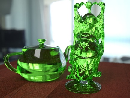 Le paramètre Profondeur permet l’absorption dans le matériau. Si la profondeur est égale à 0,0, un modèle infographique de transparence classique est utilisé, dans lequel la lumière devient colorée à la surface et n'est pas affectée par son passage à l'intérieur de l'objet. Par conséquent, l'épaisseur de l'objet n'a aucun effet.