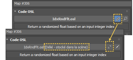Les textures OSL qui exécutent les ombrages préchargés dans le navigateur de textures, et la texture OSL de la section Général sont identiques. La seule différence réside dans le glissement d'éléments de la section OSL : la texture OSL est en mode lié par défaut et son fichier est préchargé dans le fichier OSL approprié.