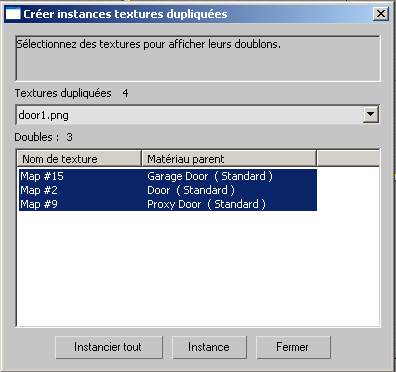 Lorsque vous sélectionnez une texture dans la liste Textures dupliquées, 3ds Max affiche ses doublons dans la liste Doubles, qui présente les noms des textures et les noms des matériaux parent. Le nombre après " Doubles " indique le nombre de copies trouvées dans la scène. Les textures de cette liste peuvent être sélectionnées individuellement. Seuls les doublons sélectionnés dans cette liste seront consolidés dans l'instance finale si vous cliquez sur le bouton Instance. L'instance créée prend le nom du premier doublon sélectionné dans la liste.
