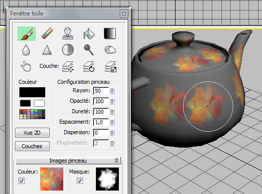 Conseil : Pour optimiser les performances obtenues avec la fenêtre Toile lorsque vous peignez des bitmaps, augmenter la résolution de maillage de l'objet que vous peignez. De même, pour éviter des anomalies visibles dans la texture, évitez que les coordonnées des textures ne se chevauchent.