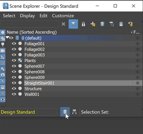 L’interface d’un explorateur de scènes comprend une barre de menus, des barres d’outils et une vue en tableau des objets de la scène, avec une ligne par objet et une colonne par propriété d’objet affichée. Dans 3ds Max, la disposition par défaut affiche uniquement les noms d’objet et la propriété Gelé. Vous pouvez personnaliser la présentation de façon à afficher les propriétés de votre choix. Vous pouvez créer des configurations d'explorateurs de scènes locaux, qui enregistrent et chargent la scène actuelle, et des configurations globales, disponibles dans toutes les scènes.