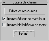 Lorsque cette option est activée, la boîte de dialogue Editeur de chemin de bitmaps affiche les matériaux de la bibliothèque de matériaux actuelle ainsi que les matériaux affectés aux objets de la scène. Cette option est désactivée par défaut.