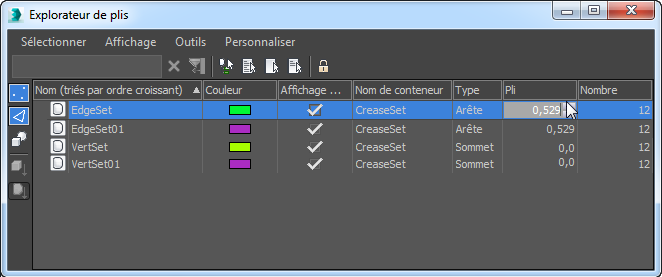 L'explorateur de plis fournit une interface semblable à une feuille de calcul pour gérer les jeux de plis définis dans les modificateurs CreaseSet et Pli.