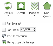 Le groupe de fonctions Sélectionner comprend les outils Dessus, Ouvert et Modèles, qui permettent d'effectuer des sélections de sous-objets à tous les niveaux, plus l'outil Dur pour sélectionner des arêtes au niveau des bordures des groupes de lissage et des outils de sélection supplémentaires pour les polygones.