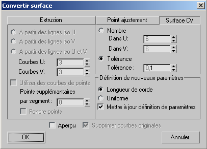 Lorsque cette option est activée, 3ds Max calcule le nombre de CV. Cette option reconstruit la surface en fonction de la précision. Plus la valeur de la tolérance est faible, plus la reconstitution sera précise. L’augmentation de la tolérance permet de reconstituer la surface en utilisant moins de CV.