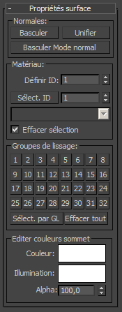 Ces commandes vous permettent de travailler avec des normales de faces, des ID matériaux, des groupes de lissage et des couleurs de sommet.