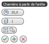 Charnière à partir de l'arête utilise l'interface de chariot lorsque l'option Activer commandes chariot est activée. Lorsque cette dernière est désactivée, la boîte de dialogue des paramètres standard est utilisée. Pour plus de détails sur l'utilisation des commandes du chariot, reportez-vous à la rubrique Interface du chariot.