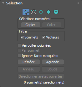 Le panneau déroulant Sélection, contient des boutons permettant de sélectionner le niveau de sous-objet, d'utiliser des sélections nommées, des paramètres d'affichage et de filtre, et affiche des informations sur les entités sélectionnées.