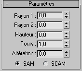 Crée une spline hélicoïdale à partir du clavier. Utilisez les paramètres X/Y/Z pour spécifier le point central et les autres paramètres pour définir les rayons et la hauteur, puis cliquez sur Créer. Après la création de la spline, vous pouvez utiliser les commandes du panneau déroulant Paramètres pour ajuster les paramètres (voir ci-dessous).