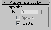 Pour les objets courbe, les commandes d’approximation de courbe apparaissent dans les paramètres de création et, pour les modèles NURBS (objets surface NURBS de niveau supérieur), dans un panneau déroulant Approximation courbe. Au niveau des modèles, les commandes d’approximation affectent tous les sous-objets courbe d’un modèle.
